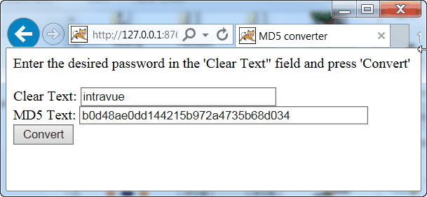 In the image above you can see intravue was added as the Clear Text password and after the Convert button was selected the MD5 text was created. The MD5 text returned is what you want to insert in the password=" " parameter in the tomcat-users.xml file.
